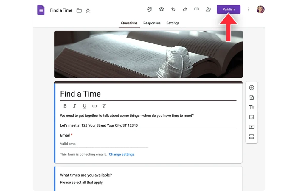 Add all the form fields you want your form to have and once it is complete click the Publish button in the top-right corner of the screen: