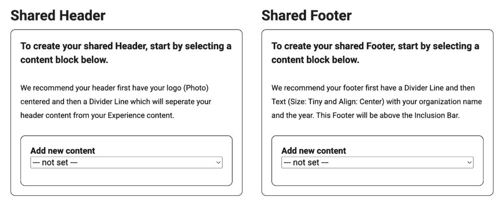- Scroll down past your list of Experiences, and you’ll see two sections: one for a Shared Header and one for a Shared Footer.